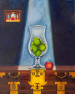 We are surrounded by “still life” snap shots of what is concrete in our daily lives– the table of seemingly random yet cohesive objects or the light through a tree on the city sidewalk. For some these moments never matter; they are never captured on the canvas of the mind. For me it is more. It is an intellectual challenge laid out before me in the form of three pears on an antique table; a glimpse into how each of us uses and relates to these objects. I seek to imagine the story behind the façade– the how, the why, and the relationship of each object to each other and to the whole composition. Using a palette of brilliant richness and jewel colors, each painting is executed with deep respect for the layers and artistry of the Masters.